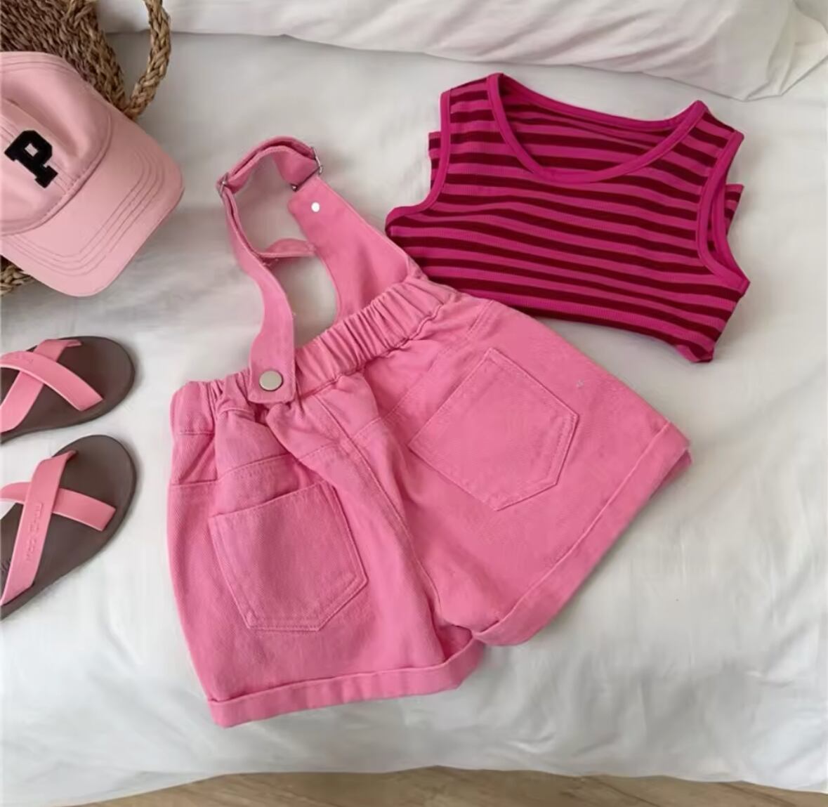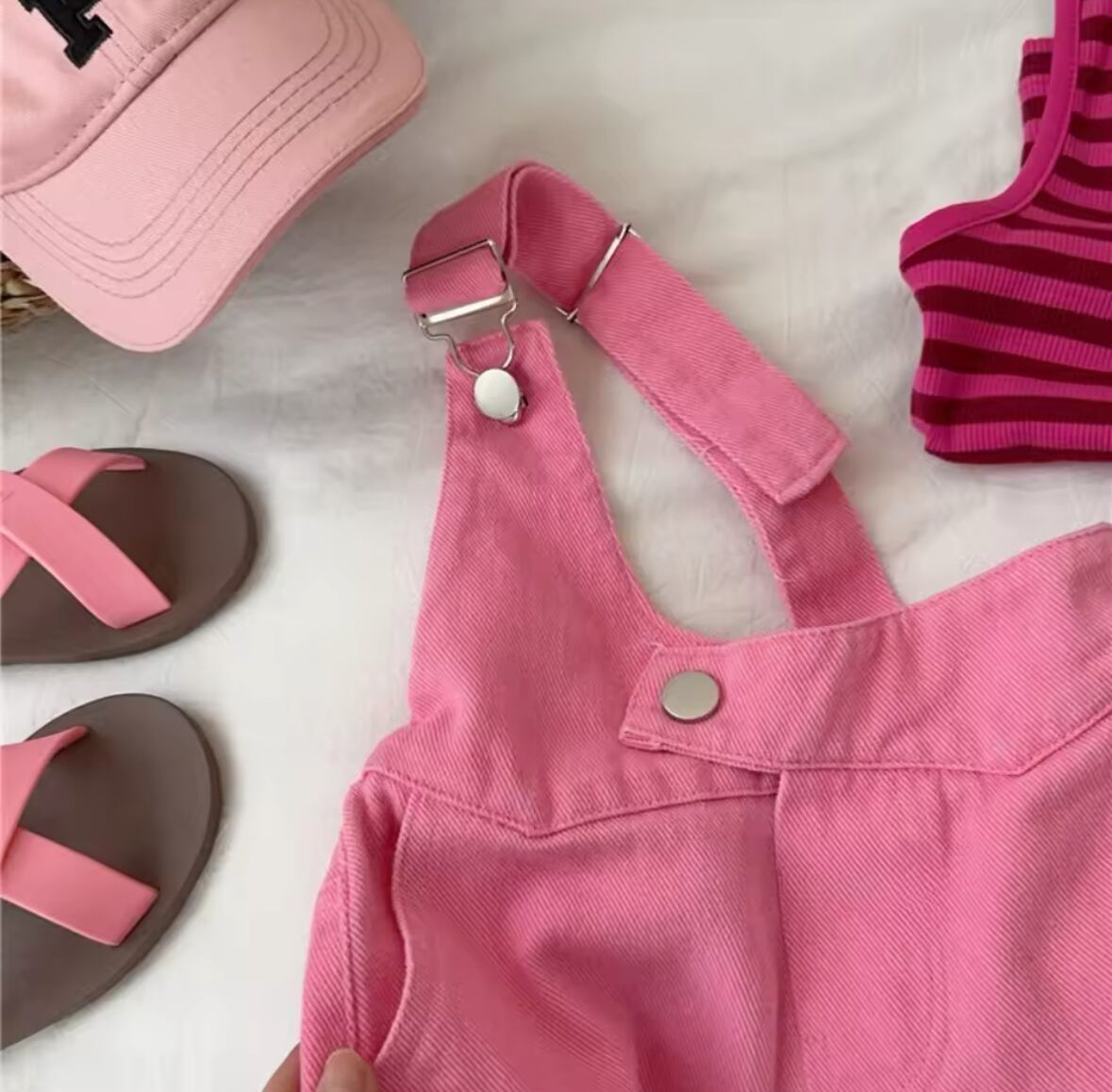 ビビットピンクのオーバーオールなので